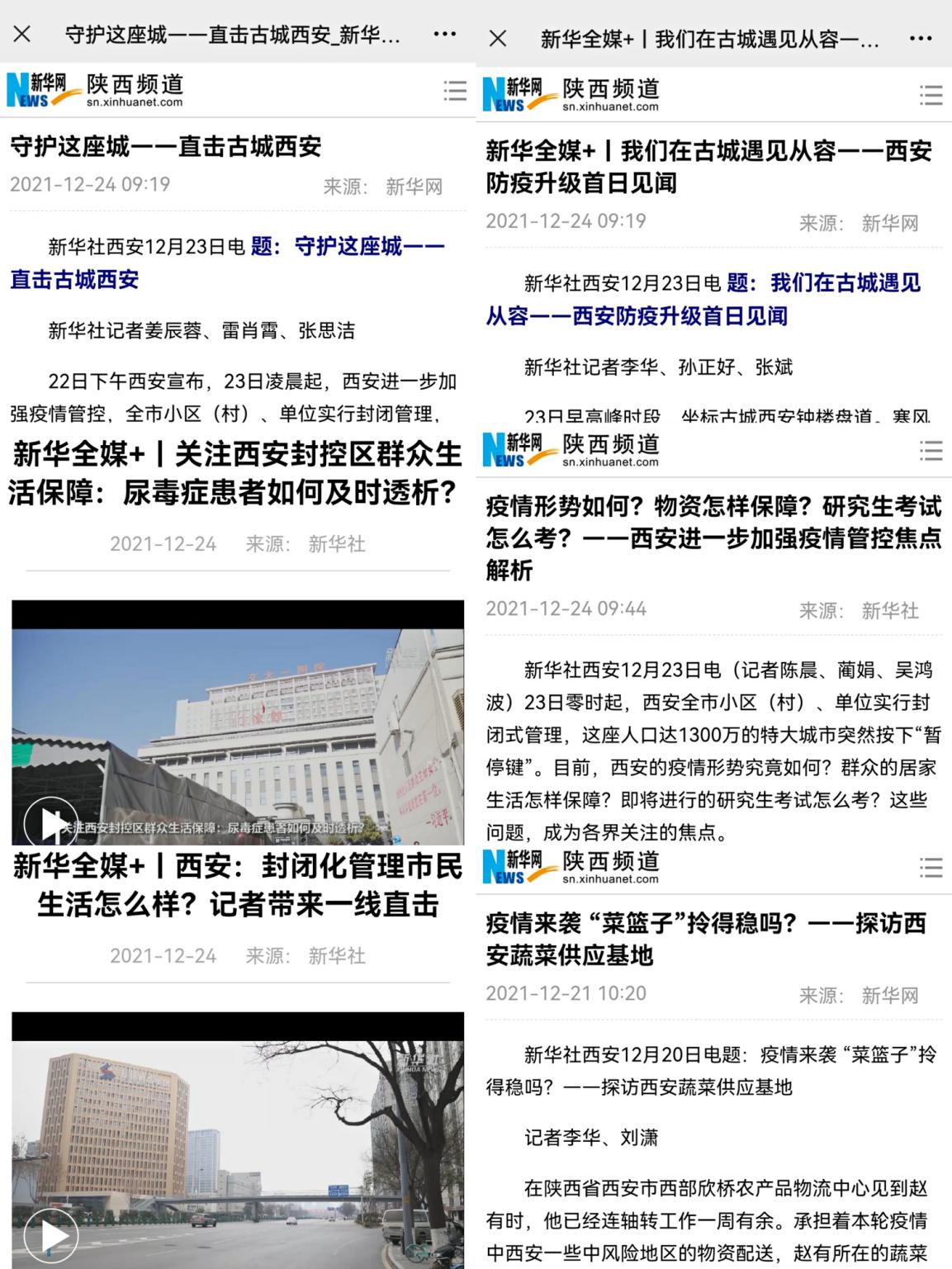 從關(guān)注尿毒癥患者如何及時(shí)透析到封閉化管理市民生活怎樣,從西安防疫升級(jí)首日見聞到記者答疑確診病例為何增長迅速,從新一輪核酸檢測現(xiàn)場到蔬菜保供打消市民恐慌……新華社記者每天從城市的各個(gè)角落發(fā)回第一手消息,用他們的筆觸、鏡頭向廣大網(wǎng)民展現(xiàn)西安城的堅(jiān)守和溫暖,最大程度還原這座城市疫情防控過程中每一個(gè)環(huán)節(jié)的進(jìn)展與成效。