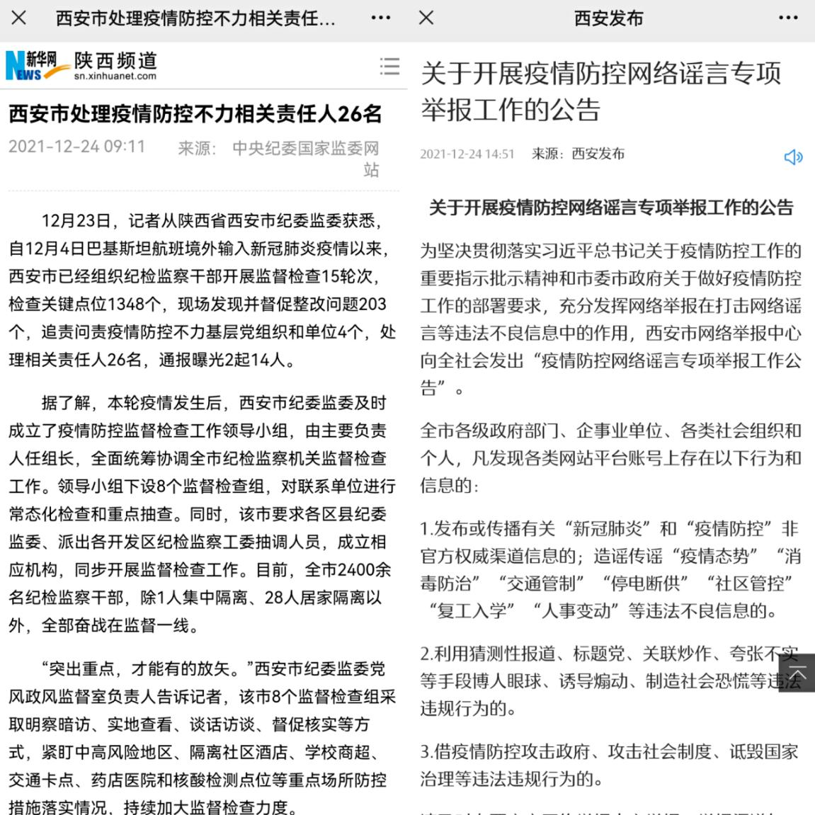 對(duì)在疫情防控工作中不擔(dān)當(dāng)、不作為,推諉扯皮、消極應(yīng)付等形式主義官僚主義問題,西安市嚴(yán)肅查處、精準(zhǔn)問責(zé)、及時(shí)曝光,進(jìn)一步嚴(yán)明疫情防控紀(jì)律,壓緊壓實(shí)各方責(zé)任。目前,西安市已經(jīng)組織紀(jì)檢監(jiān)察干部開展監(jiān)督檢查15輪次,檢查關(guān)鍵點(diǎn)位1348個(gè),現(xiàn)場發(fā)現(xiàn)并督促整改問題203個(gè),追責(zé)問責(zé)疫情防控不力基層黨組織和單位4個(gè),處理相關(guān)責(zé)任人26名,通報(bào)曝光2起14人。