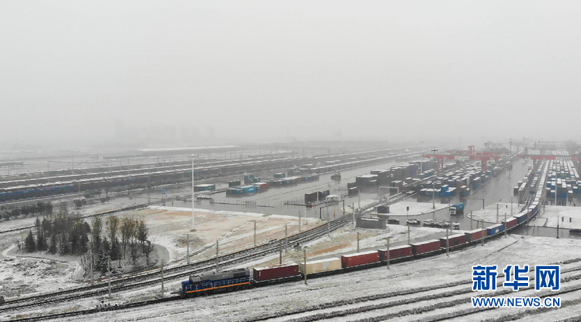 12月25日,X9003次中歐班列在雪中裝運完畢,駛出西安國際港站。馬澤旭 攝