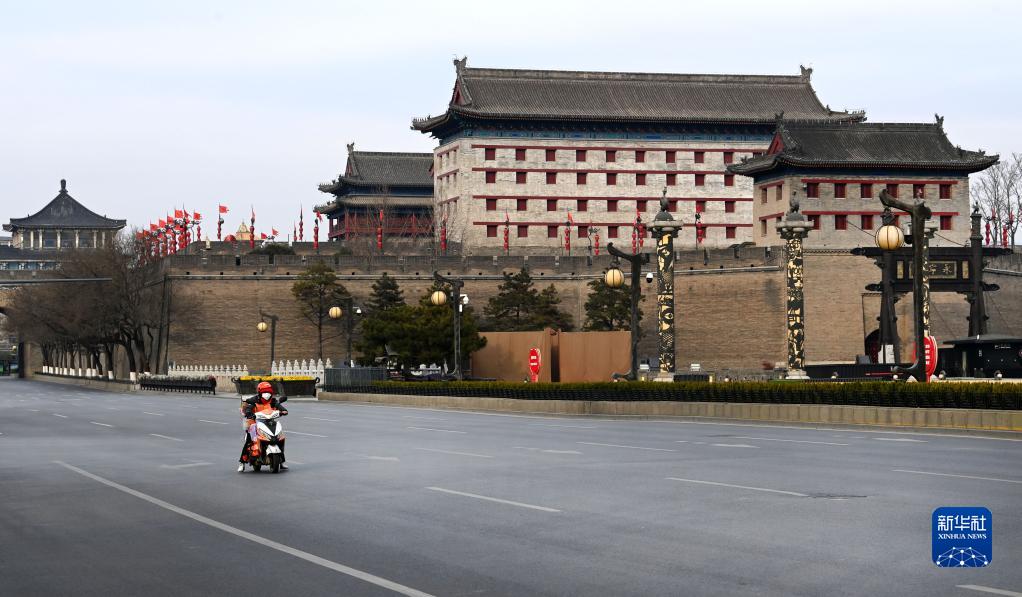 12月28日,一名快遞員行駛在西安市永寧門(mén)外的盤(pán)道上。新華社記者 陶明 攝