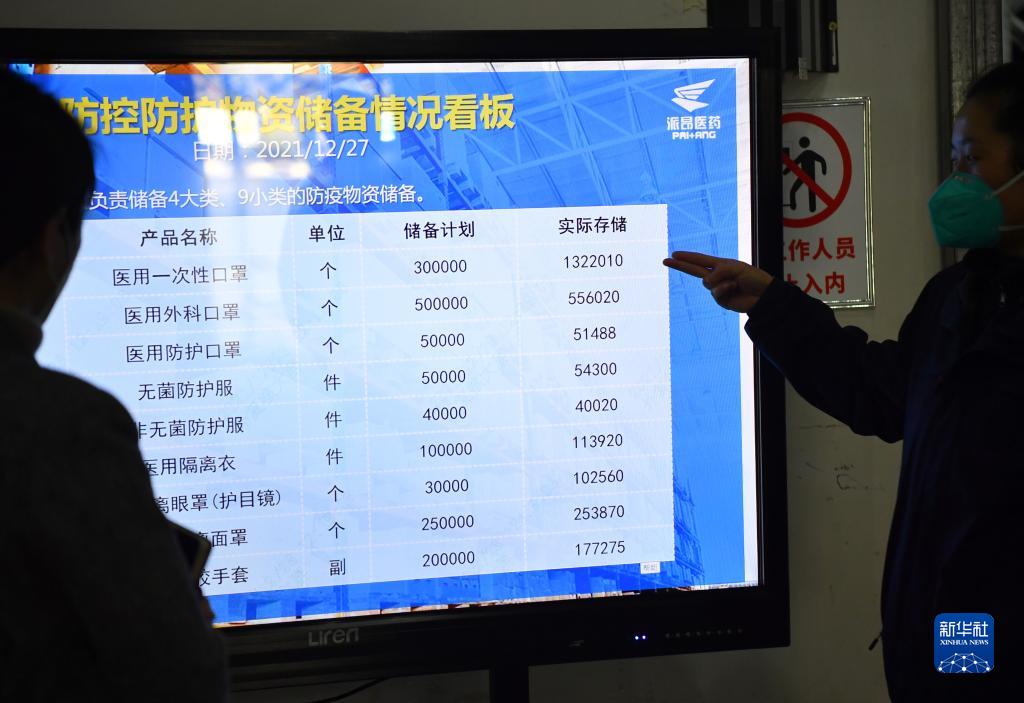 12月28日,陜藥集團(tuán)派昂醫(yī)藥公司工作人員在查看倉(cāng)庫(kù)內(nèi)的疫情防控防護(hù)物資儲(chǔ)備情況。新華社記者 邵瑞 攝