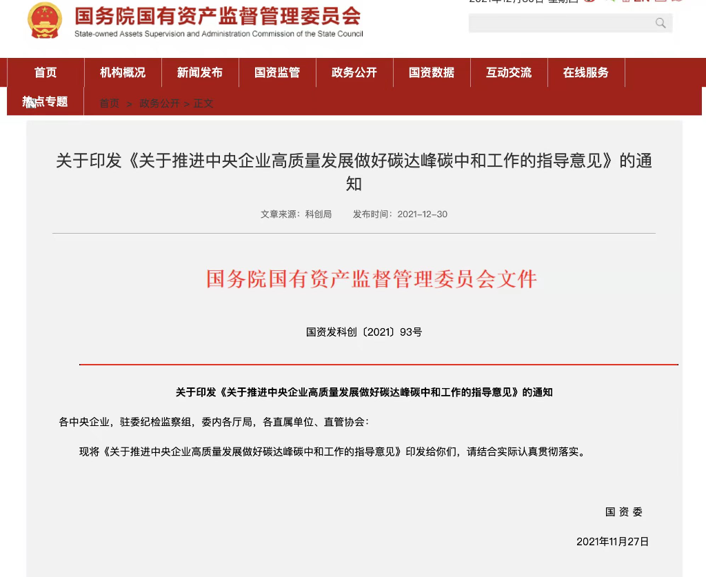 國務院國資委30日對外發(fā)布《關于推進中央企業(yè)高質量發(fā)展做好碳達峰碳中和工作的指導意見》,明確了中央企業(yè)做好碳達峰碳中和工作的總體要求與主要目標。