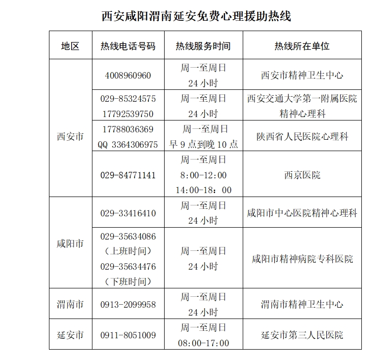 省新冠肺炎疫情醫(yī)療救治心理干預專家組,組建心理援助熱線工作團隊,24小時為疫情心理求助者提供心理援助服務。同時,省衛(wèi)生健康委會同省政務服務中心在省12320衛(wèi)生熱線開通疫情心理援助熱線專席,依托陜西12345對全省有關疫情心理干預的訴求進行引導和分轉。