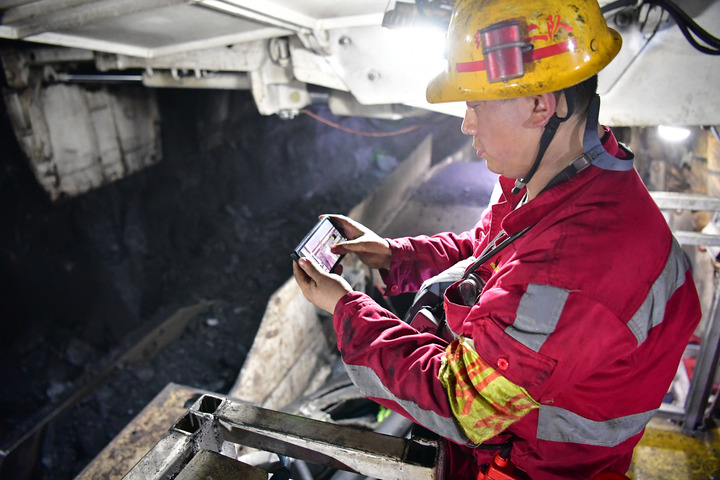 在曹家灘智慧礦山智能化工作面內(nèi),綜采二隊機電副隊長蔡進通過操作手機控制生產(chǎn)設備。新華社記者邵瑞 攝