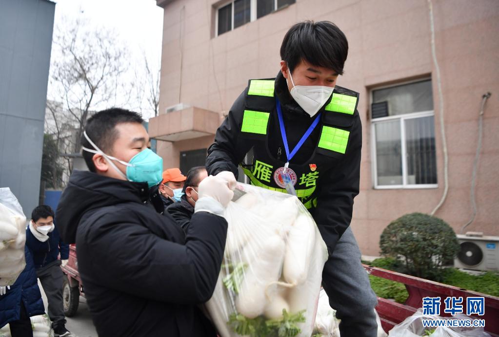 退役軍人志愿突擊隊(duì)隊(duì)員侯磊(右)協(xié)助社區(qū)工作人員搬運(yùn)物資。新華社記者 張博文 攝