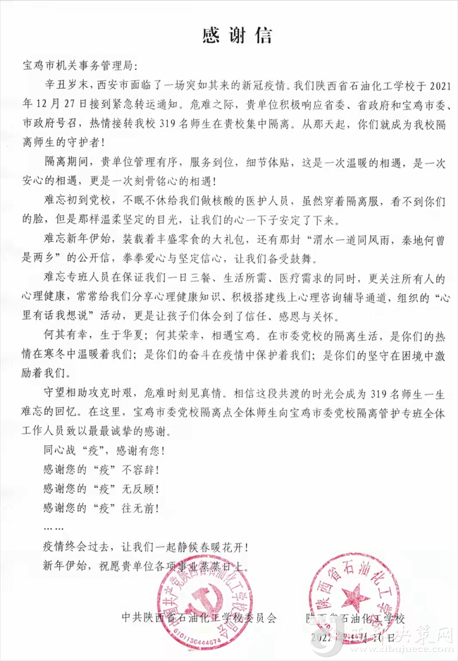 西部決策網(wǎng)訊 (任書彥)12月27日晚9時(shí),寶雞市機(jī)關(guān)事務(wù)管理局接到緊急命令:來自陜西省石油化工學(xué)校319名學(xué)生將于28日早6時(shí)到達(dá)寶雞市委黨校開始集中隔離,寶雞市機(jī)關(guān)事務(wù)管理局負(fù)責(zé)此次隔離學(xué)生的后勤保障工作。這是寶雞市機(jī)關(guān)事務(wù)管理局自全國十四運(yùn)會(huì)、第八屆特奧會(huì)之后,又迎來的一次“大考”。