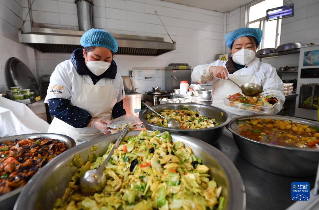 1月12日,三家村工作人員將做好的午餐裝盒準備派送。新華社記者 張博文 攝