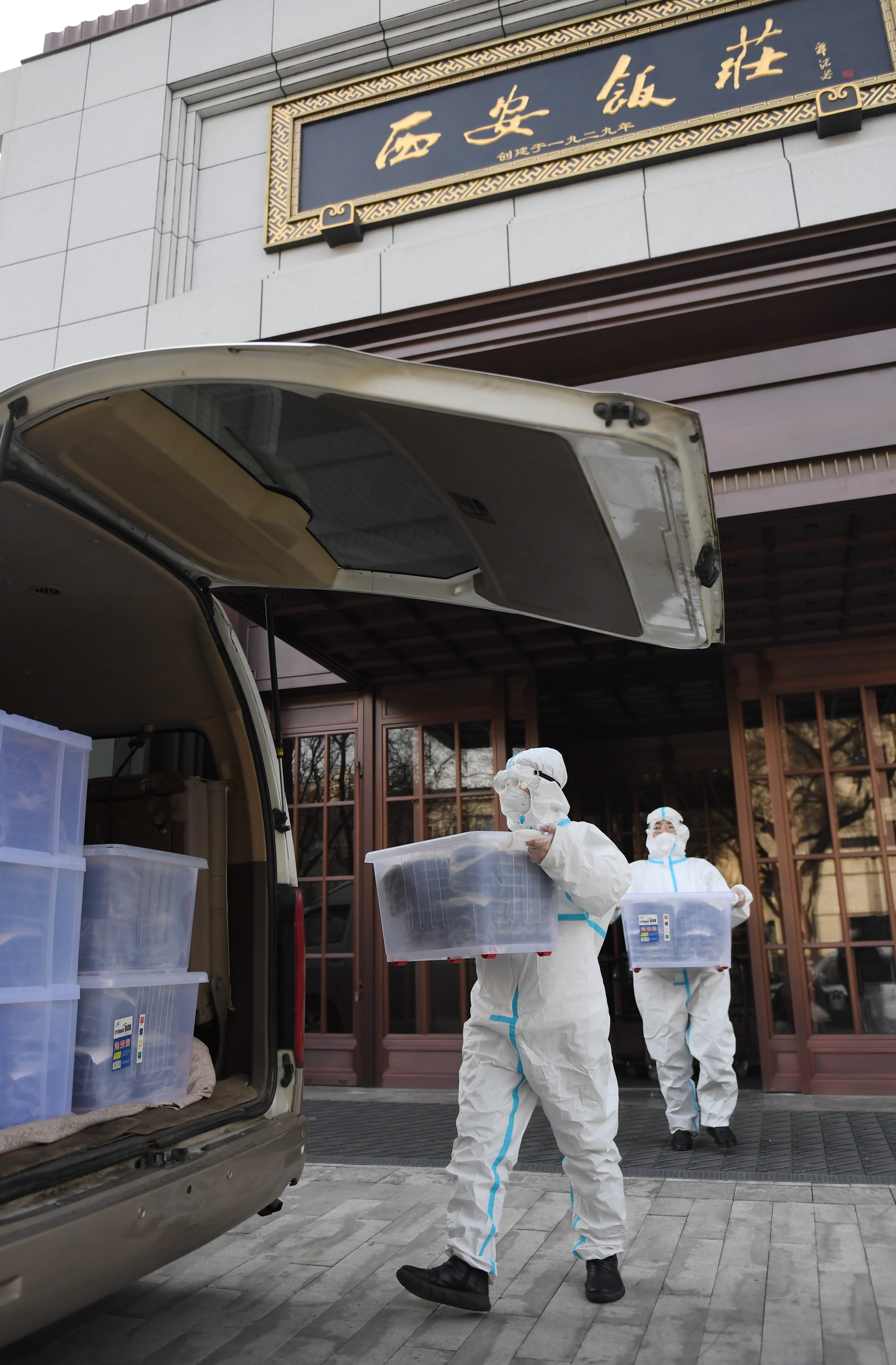 西安飯莊東大街總店工作人員正將打包好的餐食裝車(chē)。新華社記者 李一博 攝