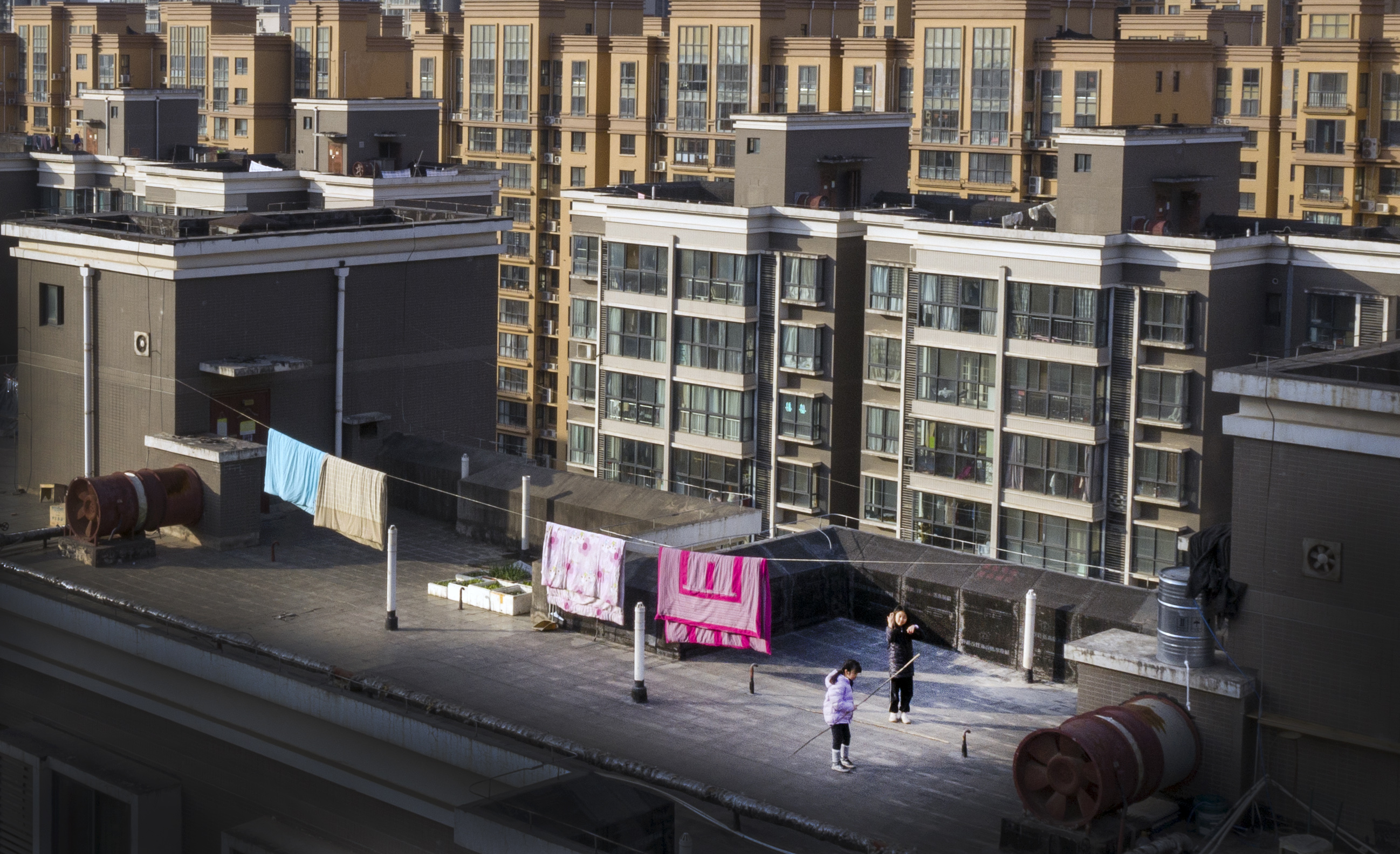 1月14日,西安市一小區(qū)居民在樓頂上跳繩鍛煉(無人機(jī)照片)。新華社記者 陶明 攝