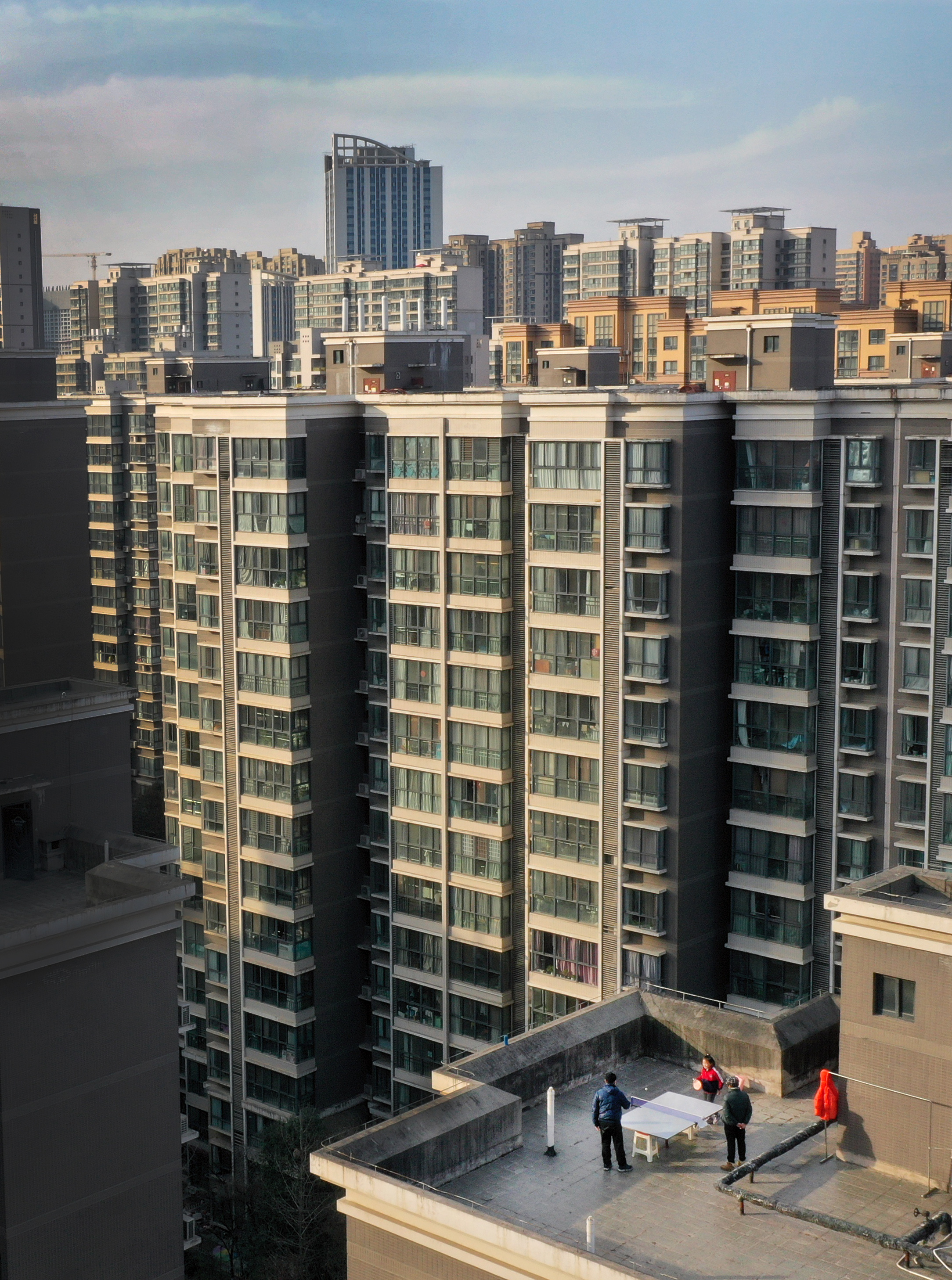 1月14日,西安市一小區(qū)居民在樓頂上打羽毛球(無人機(jī)照片)。