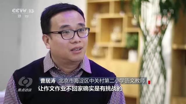 北京市海淀區(qū)中關村第二小學語文教師曹居濤說:“比如說高年級的作文,讓作文作業(yè)不回家確實是有挑戰(zhàn)的,所以我們就對教與學的方式進行了大膽的嘗試和改變。從習作布置的時間上進行了改變,叫任務前置。孩子學習單元之初,要了解這一單元當中的習作主題是什么,讓孩子的習作和生活建立聯(lián)系。”