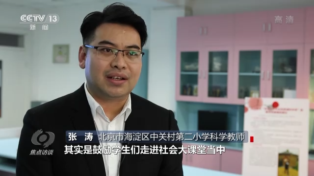 北京市海淀區(qū)中關村第二小學科學教師張濤說:“在這個過程當中,其實是鼓勵學生們走進社會大課堂當中,去發(fā)現(xiàn)生活中的一些科學問題,收集一手資料,去解決科學問題。”