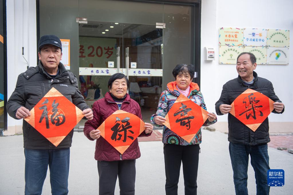 1月18日,江北區(qū)桃源小區(qū)的居民拿著寫好的字在“長者之家”門口合影。該小區(qū)老年人居住比例較高,在老舊小區(qū)改造過程中,街道將小區(qū)內(nèi)閑置用房改造成集老年大學、幼兒托管等為一體的“長者之家”。新華社記者 江漢 攝