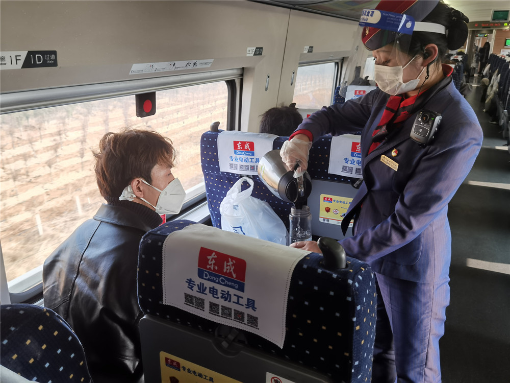 面對今年春運疫情防控形勢和大客流安全運輸壓力,全體高鐵乘務(wù)人員將嚴(yán)把安全關(guān),加強設(shè)施設(shè)備檢修維護。主動做好疫情防控,加強車廂內(nèi)消毒和衛(wèi)生清掃、為旅客提供安全衛(wèi)生的餐飲產(chǎn)品,加密列車公共部位消毒頻次、科學(xué)做好發(fā)熱旅客處置、加強旅客防護用品佩戴提醒等,用心為旅客服務(wù),讓旅客平安健康出行。
