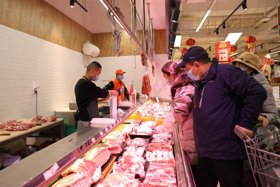 在蔬菜區(qū)、水產(chǎn)區(qū)、肉類區(qū),工作人員稱重、打包,忙得不亦樂乎。“今天一大早就有不少群眾來,各種肉類和火鍋食材賣得很快,還有顧客一次性買了800多元的肉卷。大家都說要多買點菜,好好吃頓火鍋。我們工作人員現(xiàn)場切肉、殺魚,也是忙得不可開交。”該超市一汪姓負(fù)責(zé)人表示,從上午的情況看,群眾購買商品的意愿都很強(qiáng),大家對各類商品的需求都很大。