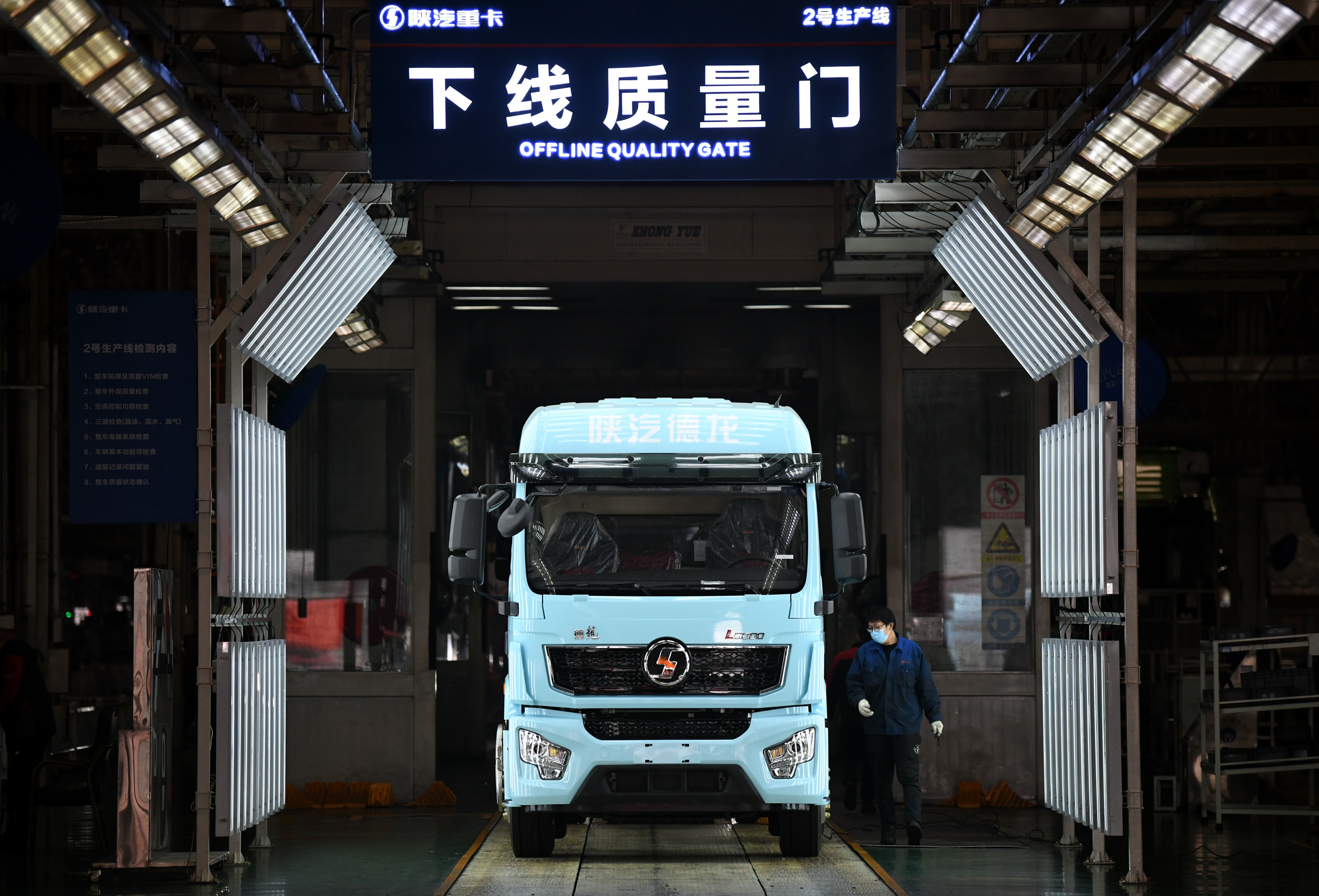 工作人員在陜汽控股集團總裝配車間驗收一輛裝配完畢的重型卡車。新華社記者 李一博 攝