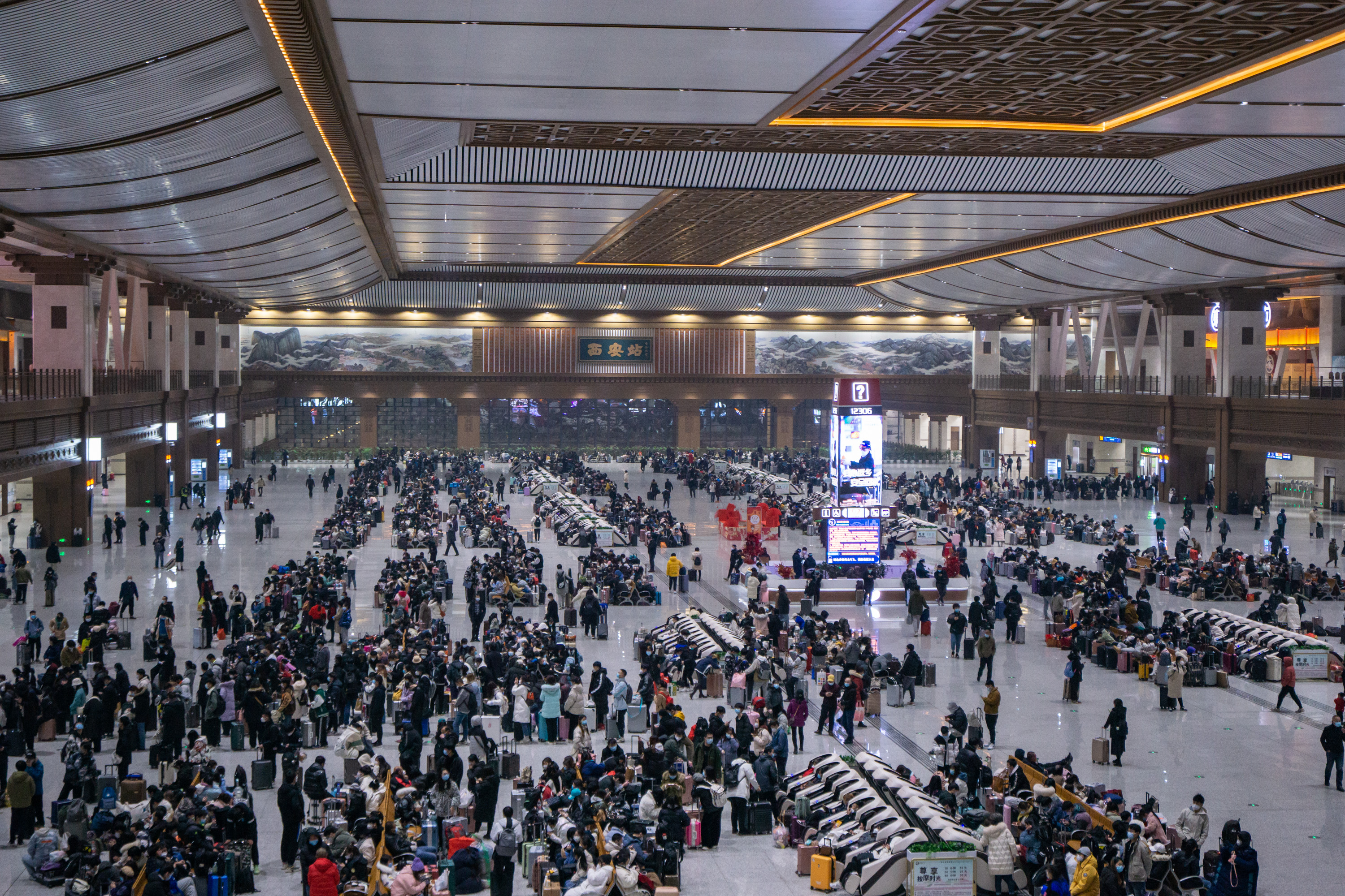西安火車站候車大廳里,來自成都的王琦和3位工友背著行李、提著給父母妻兒購買的禮物緩緩走入檢票口。