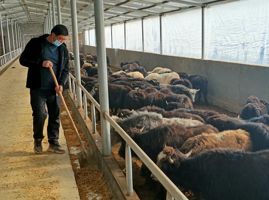 艾則孜·塔依爾在自家養(yǎng)殖大棚里照管幼年牦牛。(新華社記者潘瑩 攝)
