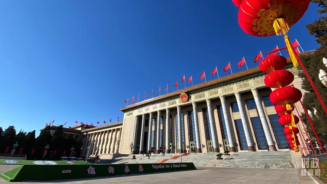 △人民大會(huì)堂外,為迎接冬奧新設(shè)計(jì)的“一起向未來”字樣格外醒目。(總臺(tái)央視記者石奇用拍攝)