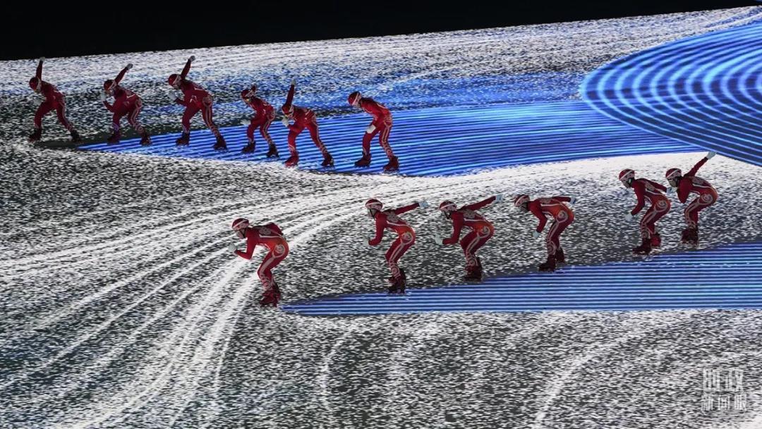 △開幕式上,滑冰運(yùn)動(dòng)員滑過冰面后,留下長(zhǎng)長(zhǎng)的軌跡。(總臺(tái)國(guó)廣記者李晉拍攝)