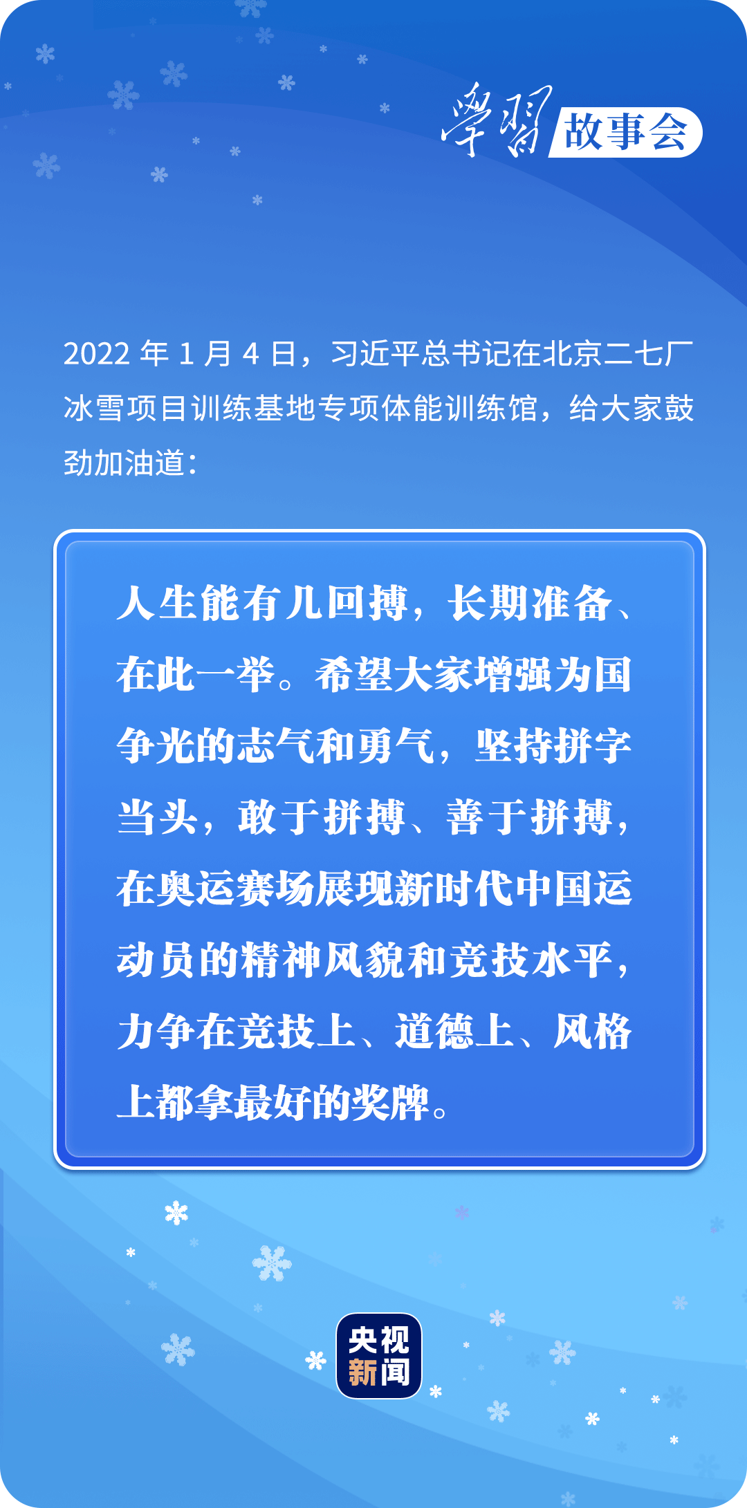 “見(jiàn)過(guò)、打過(guò)、失誤過(guò),才能做得更好。”“每一次出場(chǎng),都將全力以赴。”在拼搏中砥礪成長(zhǎng),在奮斗中實(shí)現(xiàn)夢(mèng)想。中國(guó)冰雪健兒,好樣的!