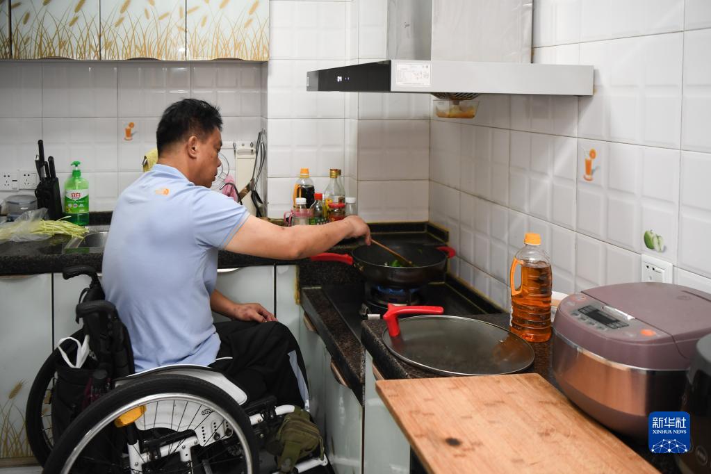 湖南省長(zhǎng)沙市天心區(qū)家中,徐經(jīng)卓在定制低位灶臺(tái)上炒菜(2021年8月25日攝)。新華社記者 薛宇舸 攝