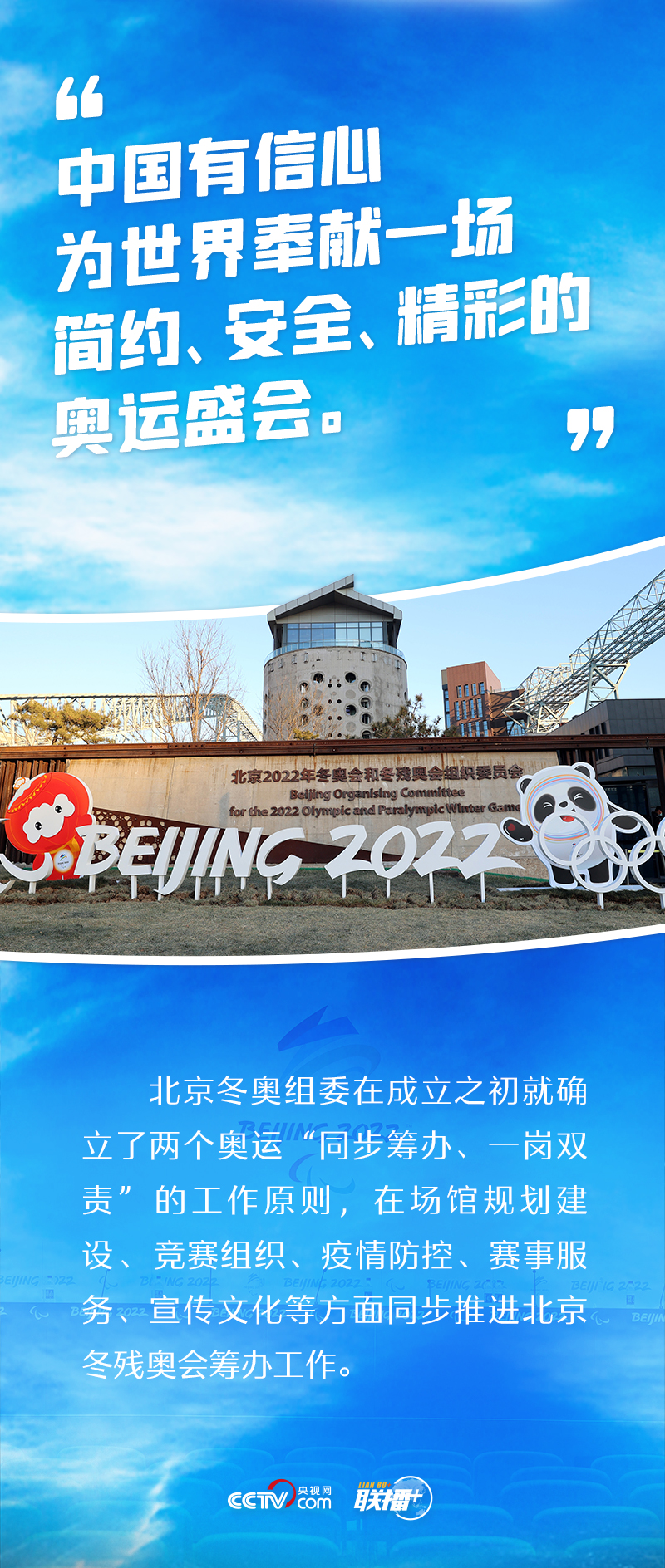 “兩個奧運,同樣精彩”,這是中國的莊嚴(yán)承諾。2015年夏天,北京攜手張家口獲得2022年冬奧會和冬殘奧會舉辦權(quán)。此后六年多,北京冬奧組委始終堅持兩個奧運“同步籌辦、一崗雙責(zé)”的工作原則,在場館規(guī)劃建設(shè)、競賽組織、疫情防控、賽事服務(wù)、宣傳文化等方面積極推進(jìn)籌辦工作,努力為廣大運動員提供一流的競賽場地和賽事服務(wù),創(chuàng)造良好的參賽體驗和參賽環(huán)境。