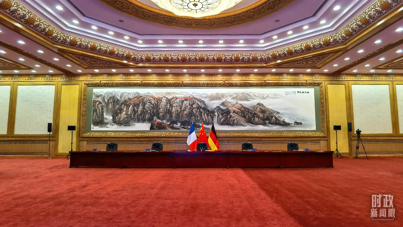 △視頻峰會(huì)現(xiàn)場(chǎng)擺放的中法德三國(guó)國(guó)旗。(總臺(tái)央視記者范一鳴拍攝)
