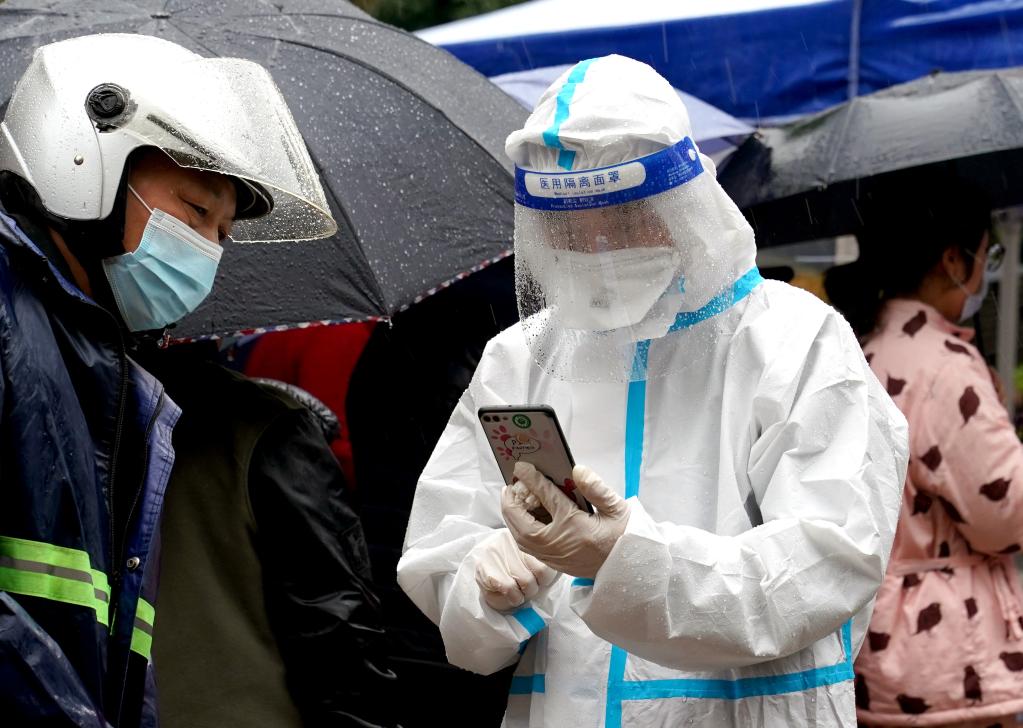 3月13日,志愿者在深圳羅湖區(qū)東門廣場(chǎng)核酸檢測(cè)點(diǎn)引導(dǎo)居民。新華社發(fā)(儲(chǔ)焱攝)