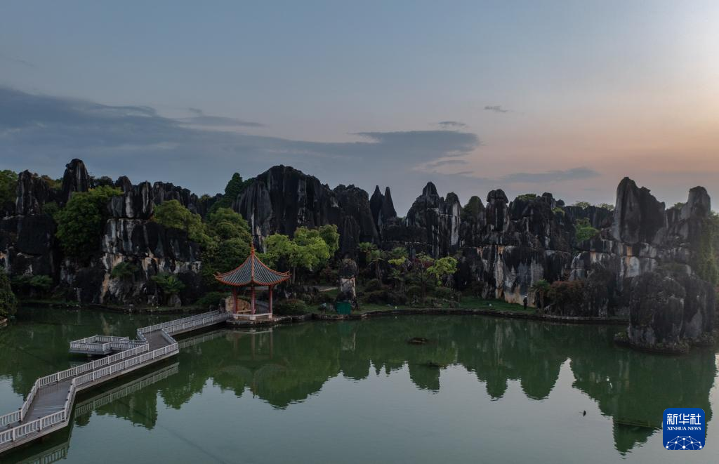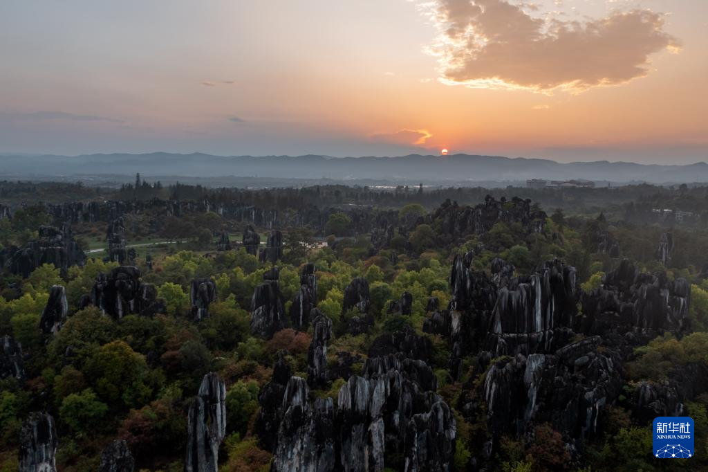 這是4月9日拍攝的石林日落景觀(無人機照片)。新華社記者 曹夢瑤 攝