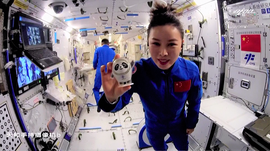 △“天宮課堂”中, 王亞平和“冰墩墩”在中國空間站同框。