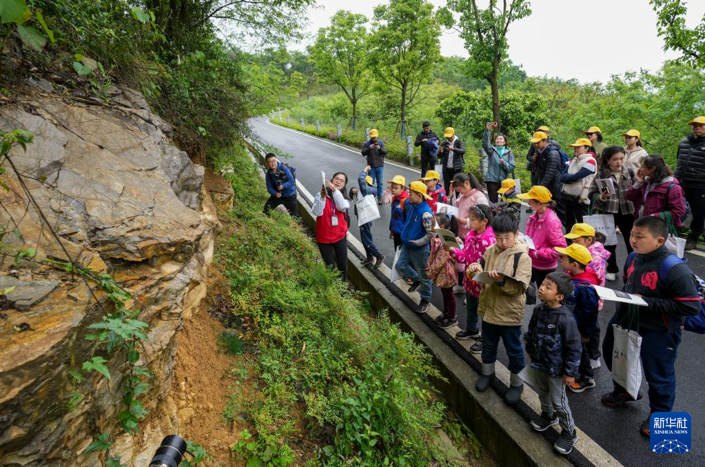 4月17日,參加活動(dòng)的地學(xué)旅游愛(ài)好者、中小學(xué)生和部分媒體工作者,在地質(zhì)專業(yè)工作人員的帶領(lǐng)下進(jìn)行銅鑼山科學(xué)考察。