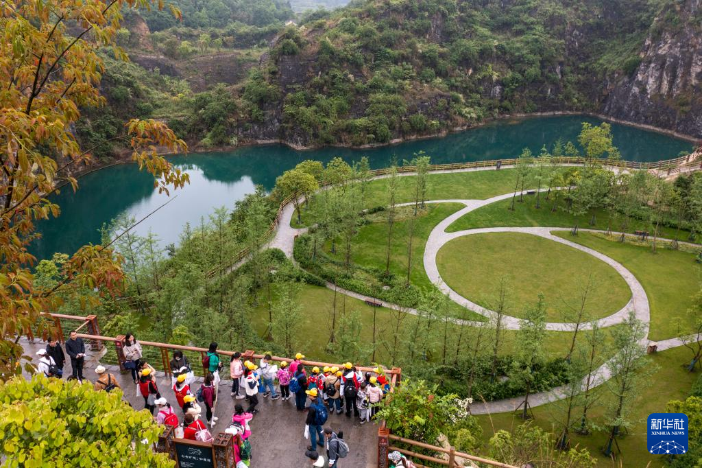 4月17日,地學(xué)旅游愛(ài)好者、中小學(xué)生和部分媒體工作者在地質(zhì)專業(yè)工作人員的帶領(lǐng)下,對(duì)銅鑼山礦山公園的地質(zhì)遺跡和生態(tài)修復(fù)進(jìn)行科學(xué)考察(無(wú)人機(jī)照片)。