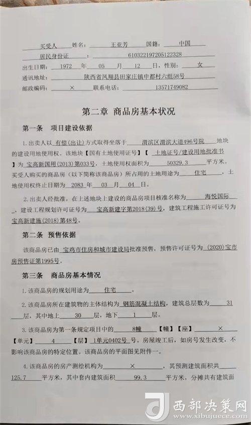 決策熱線|寶雞市民王女士(化名):我于2021年3月在寶雞市高新區(qū)渭濱大道臻和天下看了一套住宅樓,覺(jué)得地段位置也好。經(jīng)過(guò)和家人一起商議,與售樓人員確定了8幢1單元4層?xùn)|戶南北通透的房子,于2021年3月18日簽訂書(shū)面商品房買賣合同,于2021年4月15日簽訂按揭貸款合同給開(kāi)發(fā)商交清了房款,前期共花費(fèi)七十余萬(wàn)。