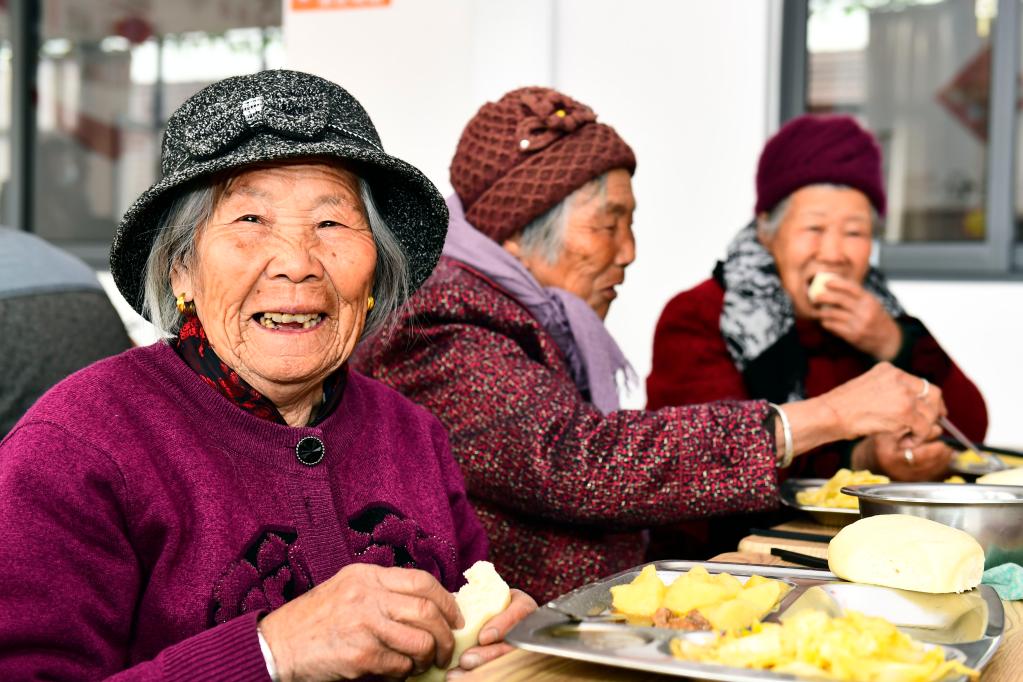 2022年2月27日,在山東日照市嵐山區(qū)虎山鎮(zhèn)黃家峪村養(yǎng)老服務(wù)中心,老人在吃午餐。新華社記者 郭緒雷 攝