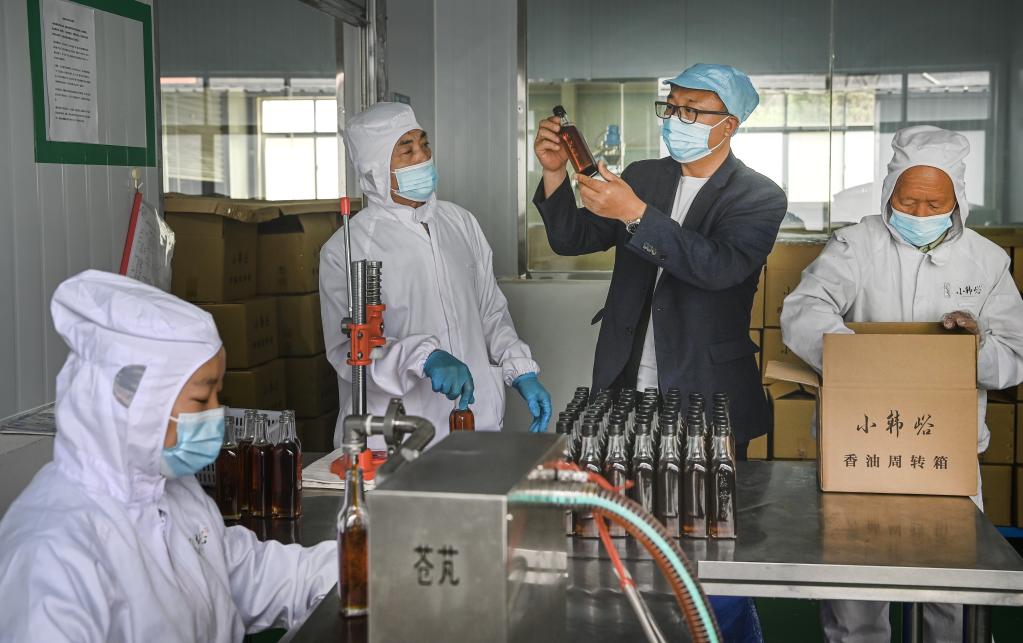 小韓峪村第一書(shū)記馮德全(右二)在小韓峪村小磨香油廠(chǎng)檢測(cè)香油品質(zhì)。新華社記者陶明 攝