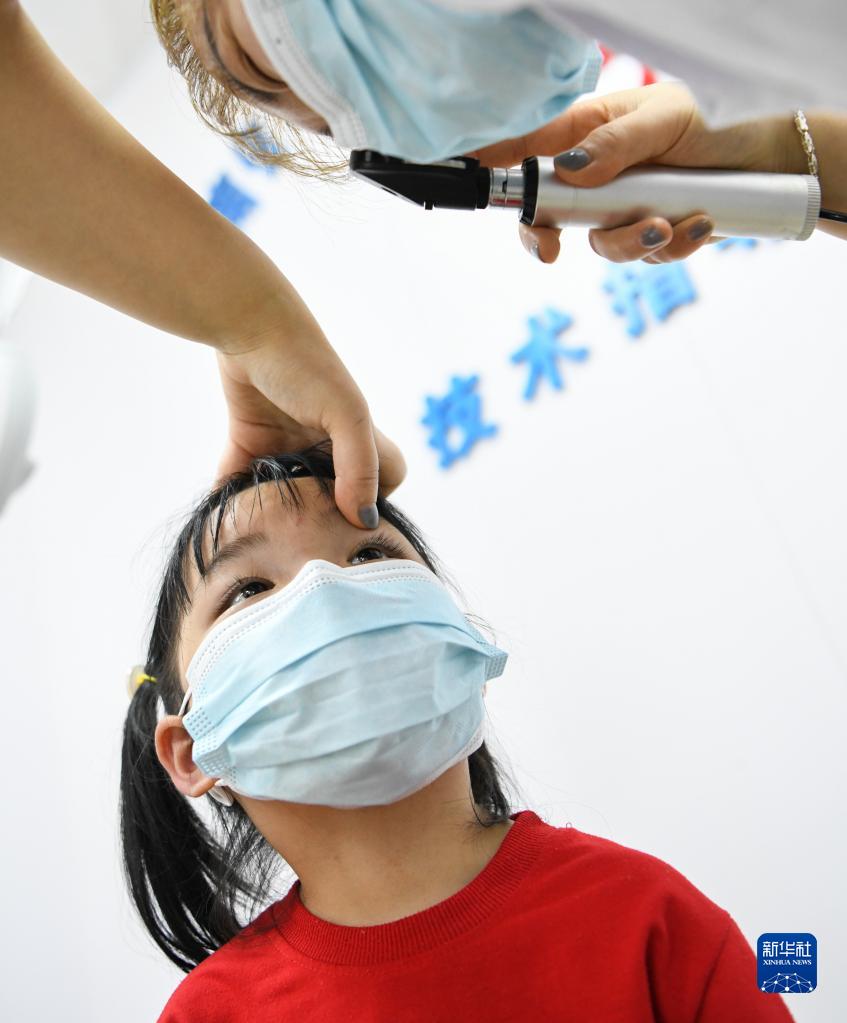 6月5日,湖南省常寧市第三人民醫(yī)院的醫(yī)護人員在為小朋友驗光。新華社發(fā)(周秀魚春 攝)