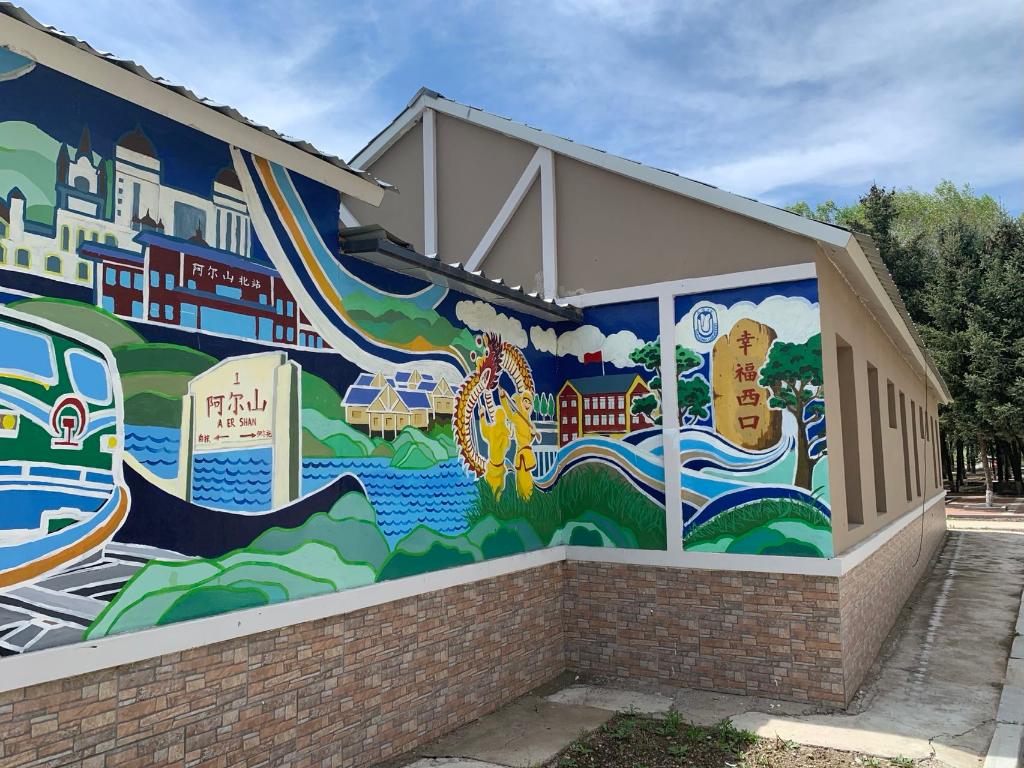 在西口村黨群服務中心,幾十面墻壁滿是各色墻繪,艷麗而靈動,灰頭土臉的老房子一下“活”了起來。這些作品都是近幾年創(chuàng)作的。尤其在2021年,西口村舉行了第一屆阿爾山市鄉(xiāng)村墻繪藝術大賽,上海大學上海美術學院、浙江藝術職業(yè)學院、廣州美術學院附中等8所院校,近千人次來到西口村,長達數(shù)月進行墻繪創(chuàng)作,總創(chuàng)作面積超1000平方米。
