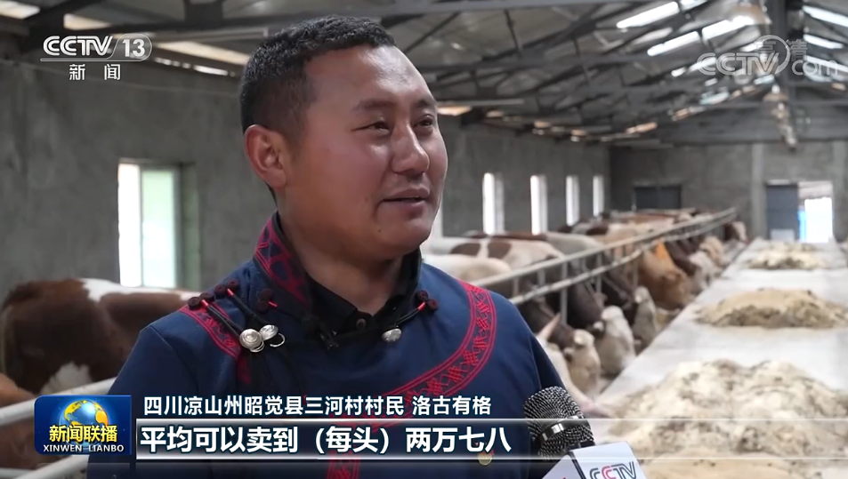 四川涼山州昭覺縣三河村村民 洛古有格:當(dāng)時(shí)總書記來(lái)的時(shí)候,我們這個(gè)養(yǎng)牛只有十幾頭。通過(guò)發(fā)展,我們?nèi)哟逵辛?000多頭這個(gè)西門塔爾?!,F(xiàn)在我們這個(gè)牛,平均可以賣到(每頭)兩萬(wàn)七八,大的可以賣到三萬(wàn)多元,效益特別好。