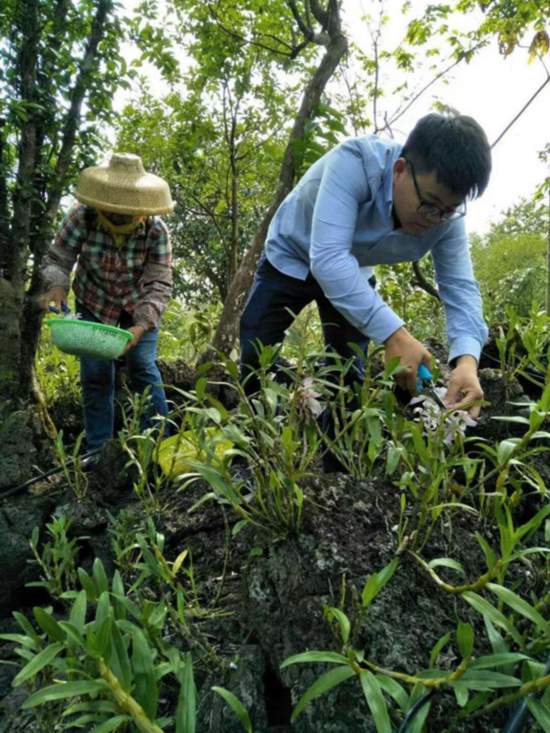 吳清偉帶領(lǐng)員工修剪火山石斛。受訪(fǎng)者供圖