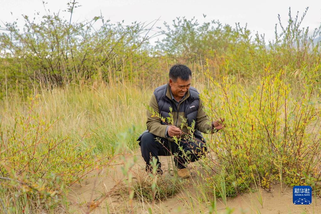 瑪曲縣自然資源局高級(jí)工程師馬建云在黃河瑪曲段干流沿岸的一處阻沙林帶建設(shè)區(qū)域觀察草方格沙障內(nèi)植被生長(zhǎng)情況(9月16日攝)。新華社記者 郎兵兵 攝