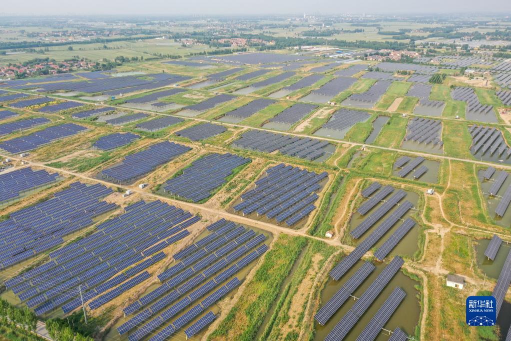 山東高青縣湖東村周邊建設(shè)的千余畝漁光互補(bǔ)養(yǎng)殖場(chǎng)(2022年5月24日攝,無(wú)人機(jī)照片)。新華社記者 朱崢 攝