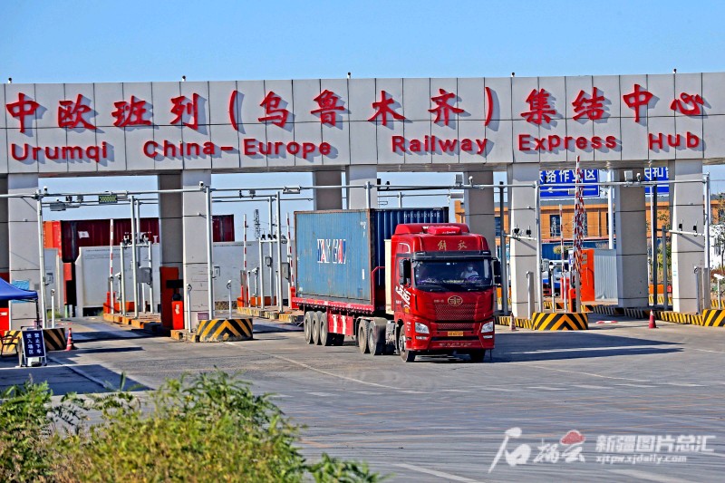7月14日,一臺(tái)卡車從烏魯木齊國際陸港區(qū)中歐班列(烏魯木齊)集結(jié)中心駛出(資料圖片)。 石榴云/新疆日?qǐng)?bào)記者 蔡增樂攝