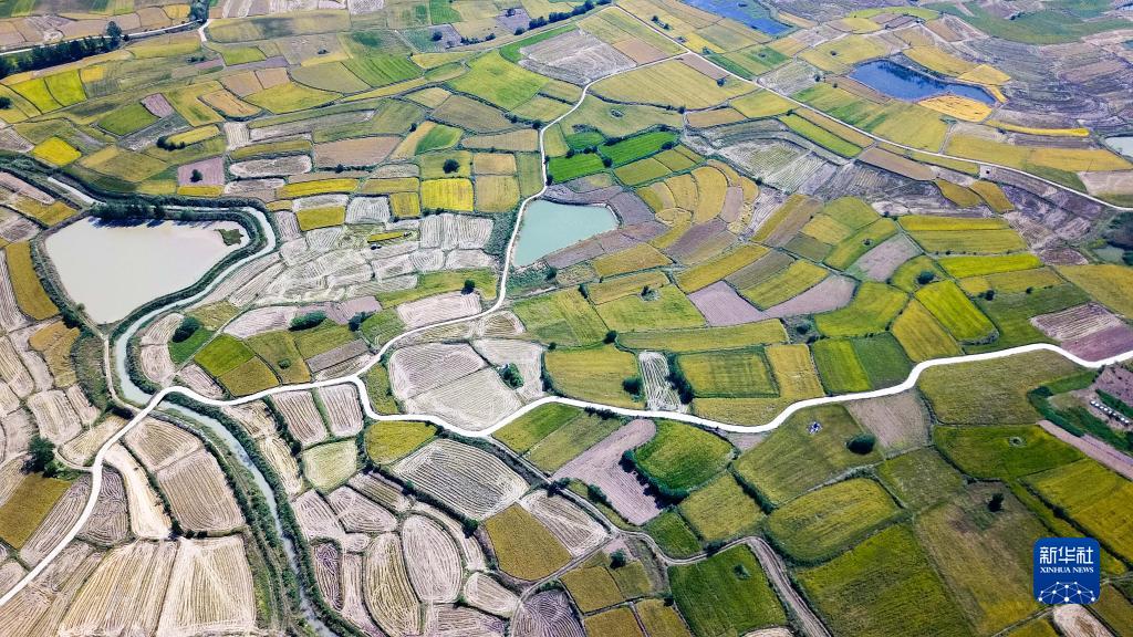 安徽省鳳陽(yáng)縣小崗村的田野景象(2018年9月27日攝,無(wú)人機(jī)照片)。新華社記者 張端 攝