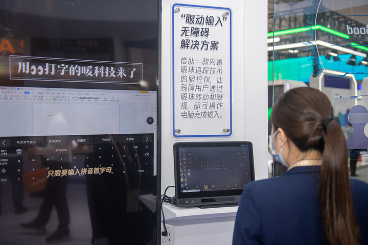 11月10日,觀眾在騰訊公司展臺(tái)體驗(yàn)“眼動(dòng)輸入”無(wú)障礙解決方案。新華社記者 江漢 攝