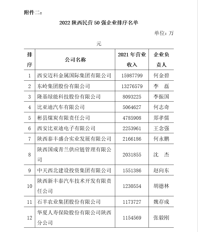 附件二:2022陜西民營企業(yè)50強排序名單