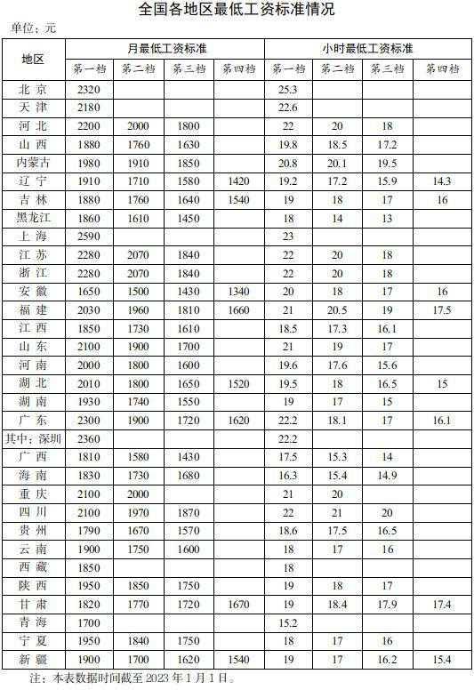 全國各地區(qū)最低工資標(biāo)準(zhǔn)情況(截至2023年1月1日),來自人社部網(wǎng)站