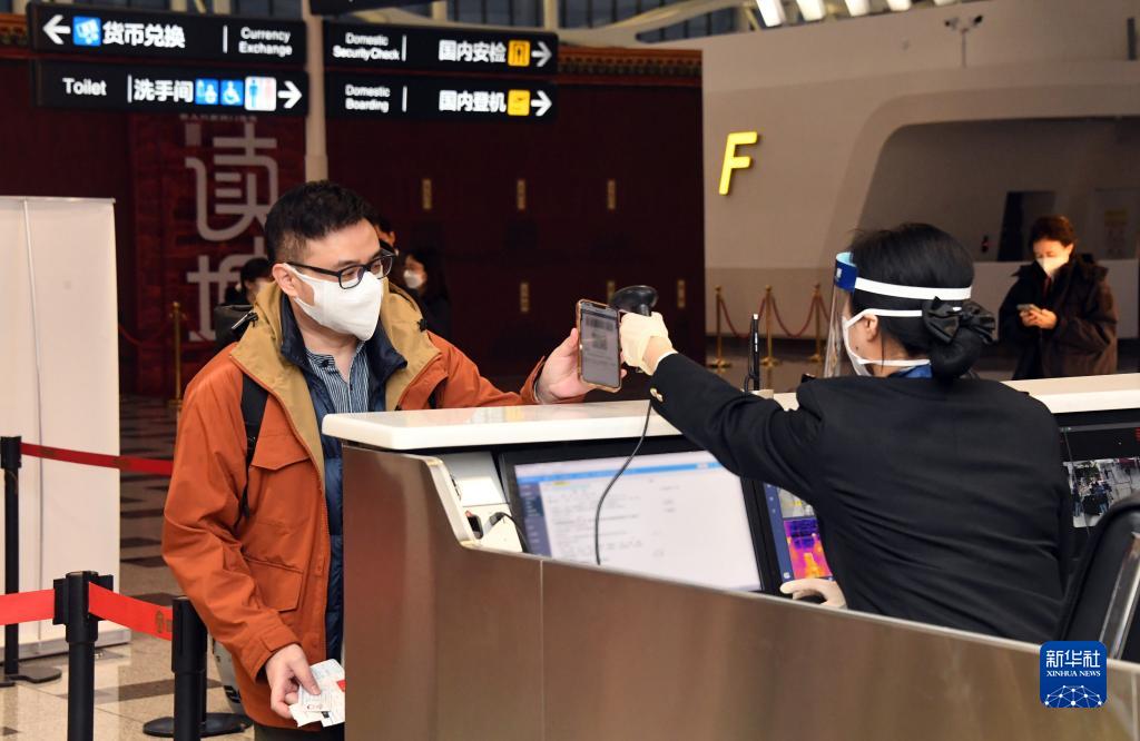 1月17日,在北京大興機(jī)場,海關(guān)關(guān)員核驗(yàn)乘坐CZ309次北京飛往香港航班旅客的海關(guān)健康申報(bào)二維碼。新華社記者 任超 攝