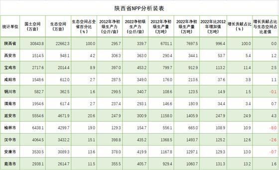全省元生產(chǎn)力區(qū)域分析結(jié)果表明,在三大區(qū)域生態(tài)蛋糕越來(lái)越大的同時(shí),生態(tài)蛋糕的空間布局上與結(jié)構(gòu)發(fā)生變化,呈現(xiàn)黃河流域綠色崛起大趨勢(shì)。陜北榆林、延安兩市,生態(tài)空間8971.6萬(wàn)畝,占全省的39.6%;關(guān)中西安、寶雞、咸陽(yáng)、渭南、銅川五市生態(tài)空間4554.5萬(wàn)畝,占全省的29.2%;陜南漢中、安康、商洛三市生態(tài)空間9136.2萬(wàn)畝,占全省的40.2%。2022年,陜北兩市提供了2070.9萬(wàn)噸植被凈初級(jí)生產(chǎn)量,占全省的26.9%,比2012年的1714.1萬(wàn)噸增加313.8萬(wàn)噸,增長(zhǎng)18.3%,在全省份額上升了1.3個(gè)百分點(diǎn);關(guān)中五市提供了1775.1萬(wàn)噸的植被凈初級(jí)生產(chǎn)量,占全省的23.1%,比2012年的1524.3萬(wàn)噸250.8萬(wàn)噸,增長(zhǎng)16.4%,在全省份額上升了0.3個(gè)百分點(diǎn);陜南三市提供了3851.5萬(wàn)噸植被凈初級(jí)生產(chǎn)量,占全省的50.0%,比2012年的3462.7萬(wàn)噸增加388.8萬(wàn)噸,增長(zhǎng)11.2%,在全省份額下降了1.6個(gè)百分點(diǎn)。2012-2022年全省新增生態(tài)蛋糕996.4萬(wàn)噸,陜北兩市貢獻(xiàn)31.5%,關(guān)中五市貢獻(xiàn)29.5%,陜南三市貢獻(xiàn)39.0%。陜北、關(guān)中提供的生態(tài)蛋糕占全省的份額已由2012年的48.4%提高到2022年的50.0%。