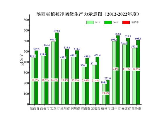 2012-2022年分市元生產(chǎn)力增長(zhǎng)率分析結(jié)果表明,新時(shí)代10年,全省各市生態(tài)蛋糕越做越大,元生產(chǎn)力均有不同程度增長(zhǎng)。有關(guān)中東大門(mén)之稱的渭南是全省元生產(chǎn)力增長(zhǎng)最快的市,增長(zhǎng)率為23.4%,從2012年237.4公斤/畝,增加到2022年的293.1公斤/畝,增加55.7公斤/畝;咸陽(yáng)、延安增長(zhǎng)率均為21.4%,并列全省第二,分別由2012年的287.5公斤/畝、247.9公斤/畝,增加到2022年的349.0公斤/畝、300.9公斤/畝,分別增加61.5公斤/畝、53公斤/畝。榆林居第四,增長(zhǎng)19.6%。其后,依次分別西安增長(zhǎng)18.5%,寶雞14.2%,商洛14.1%,銅川13.8%,安康11.1%,漢中9.1%。